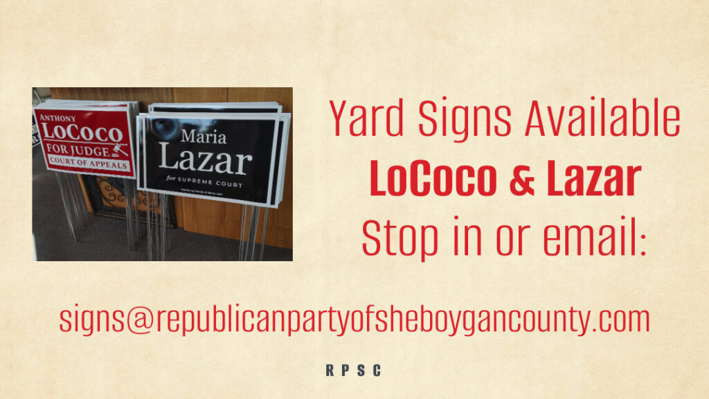 If you would like a yard sign or have questions, please contact signs@republicanpartyofsheboygancounty.com.